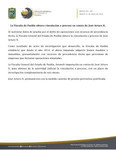 La Fiscalía General del Estado de Puebla, formuló imputación en contra de José Arturo N. para obtener de la autoridad judicial la vinculación a proceso, con un plazo de investigación complementaria de seis meses.