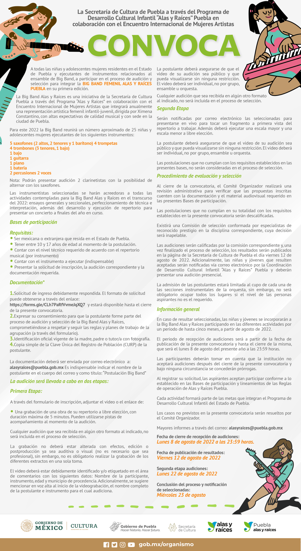 La convocatoria (que puede consultarse en el sitio web de la dependencia: sc.puebla.gob.mx) está dirigida a niñas y adolescentes de entre 10 y 17 años, de las cuales serán seleccionadas aproximadamente 25, que deberán ser ejecutantes de los siguientes instrumentos: saxofón, trompeta, trombón, bajo, guitarra, piano, batería, percusiones y voces.
