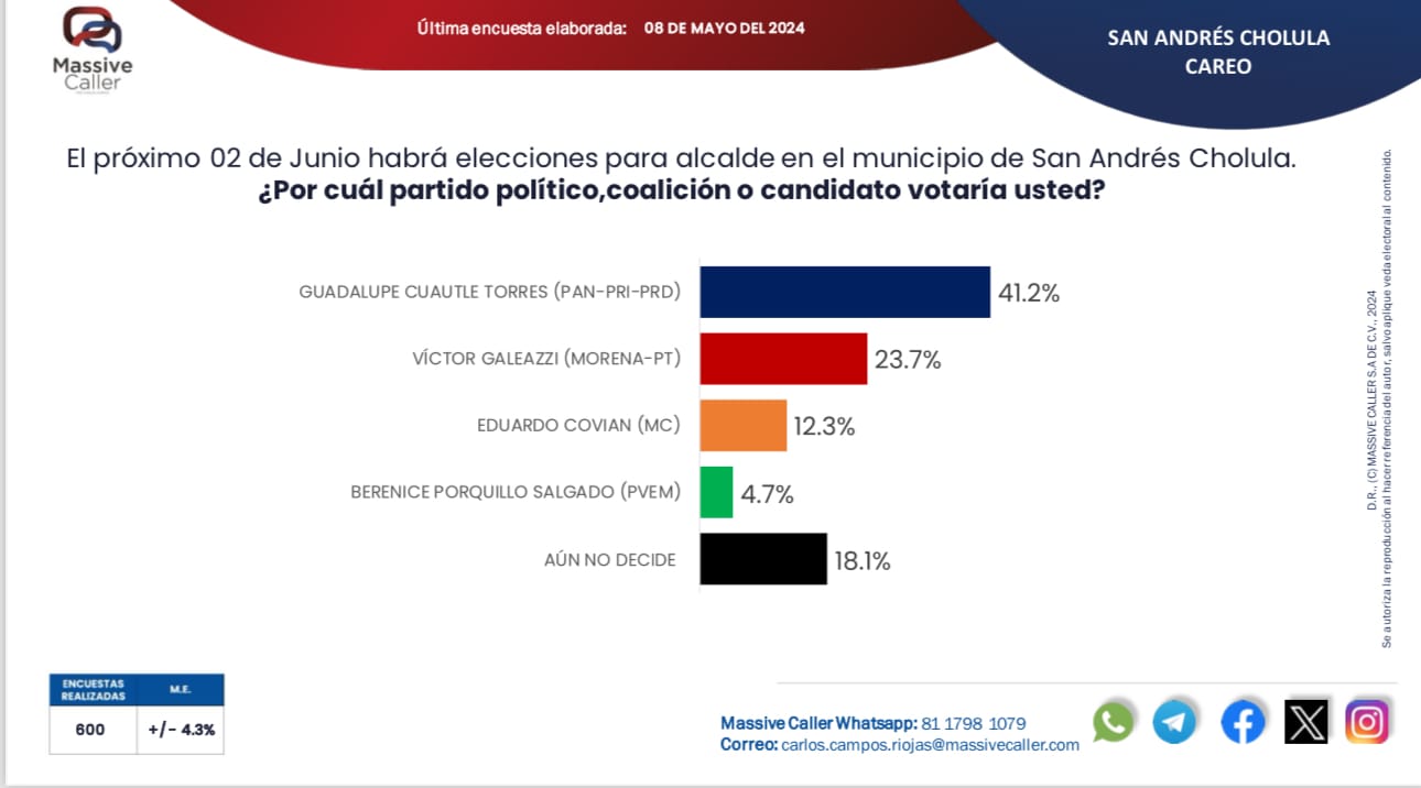 La más reciente encuesta de Massive Caller revela que Lupita Cuautle Torres encabeza las preferencias para la alcaldía de San Andrés Cholula con un 41.2%, superando a su más cercano competidor por una notable diferencia.