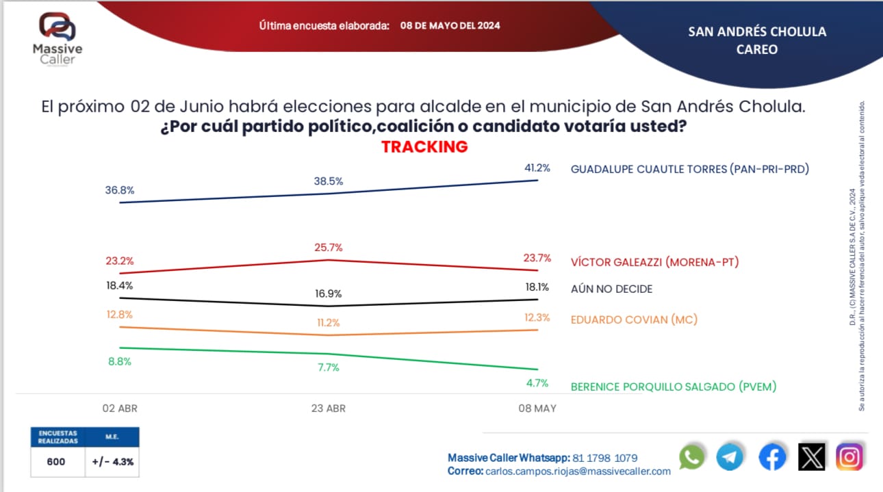 Desde el inicio del periodo de seguimiento, Cuautle ha mostrado un crecimiento sostenido en las preferencias electorales. El 2 de abril, la candidata contaba con el 36.8% de la intención de voto, que para el 23 de abril se incrementó a 38.5%. Esta tendencia ascendente se confirmó en la última encuesta del 8 de mayo, donde alcanzó el 41.2%.